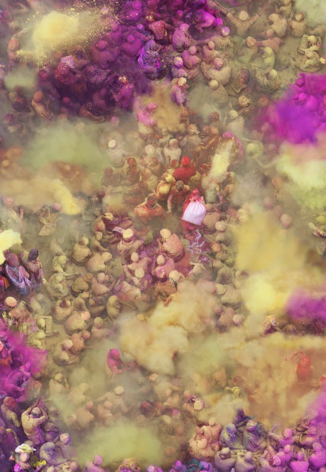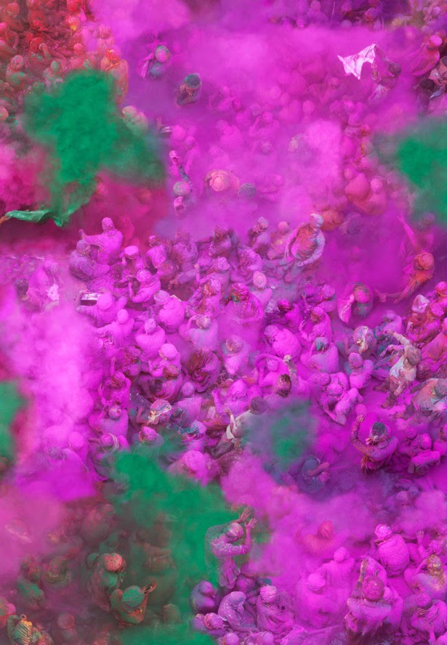 the Hindu ritual of Holi—to welcome spring—will be making it even brighter very soon. Thousands of people gather to throw colored powder and water, often perfumed, at each other—and the hues are incredible. these images, taken from above by German artist Katrin Korfmann